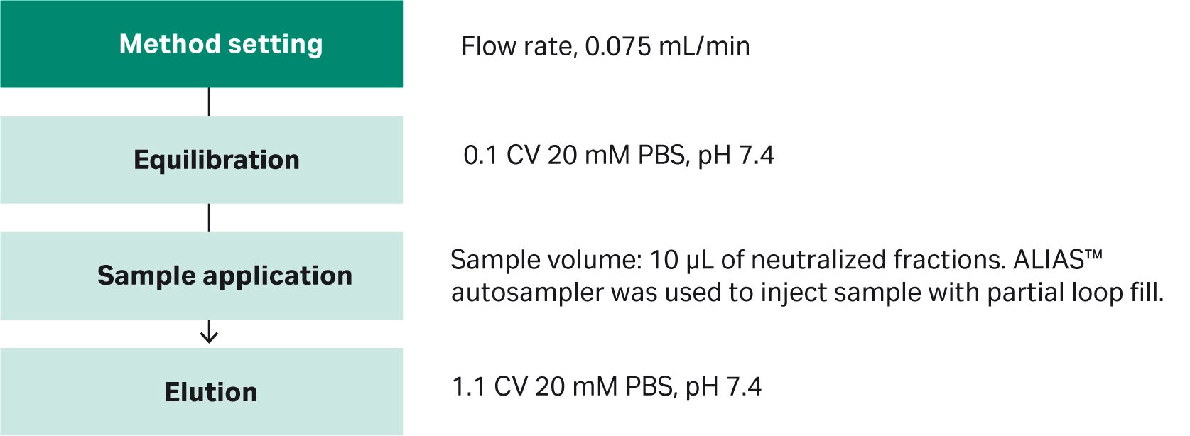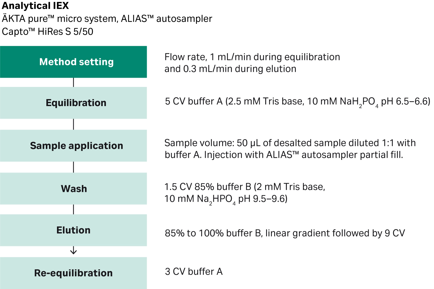 Fig 5. Protocol for analytical IEX for analysis of charged variants on Capto™ HiRes S 5/50 column using the ÄKTA pure™ micro system and ALIAS™ autosampler.