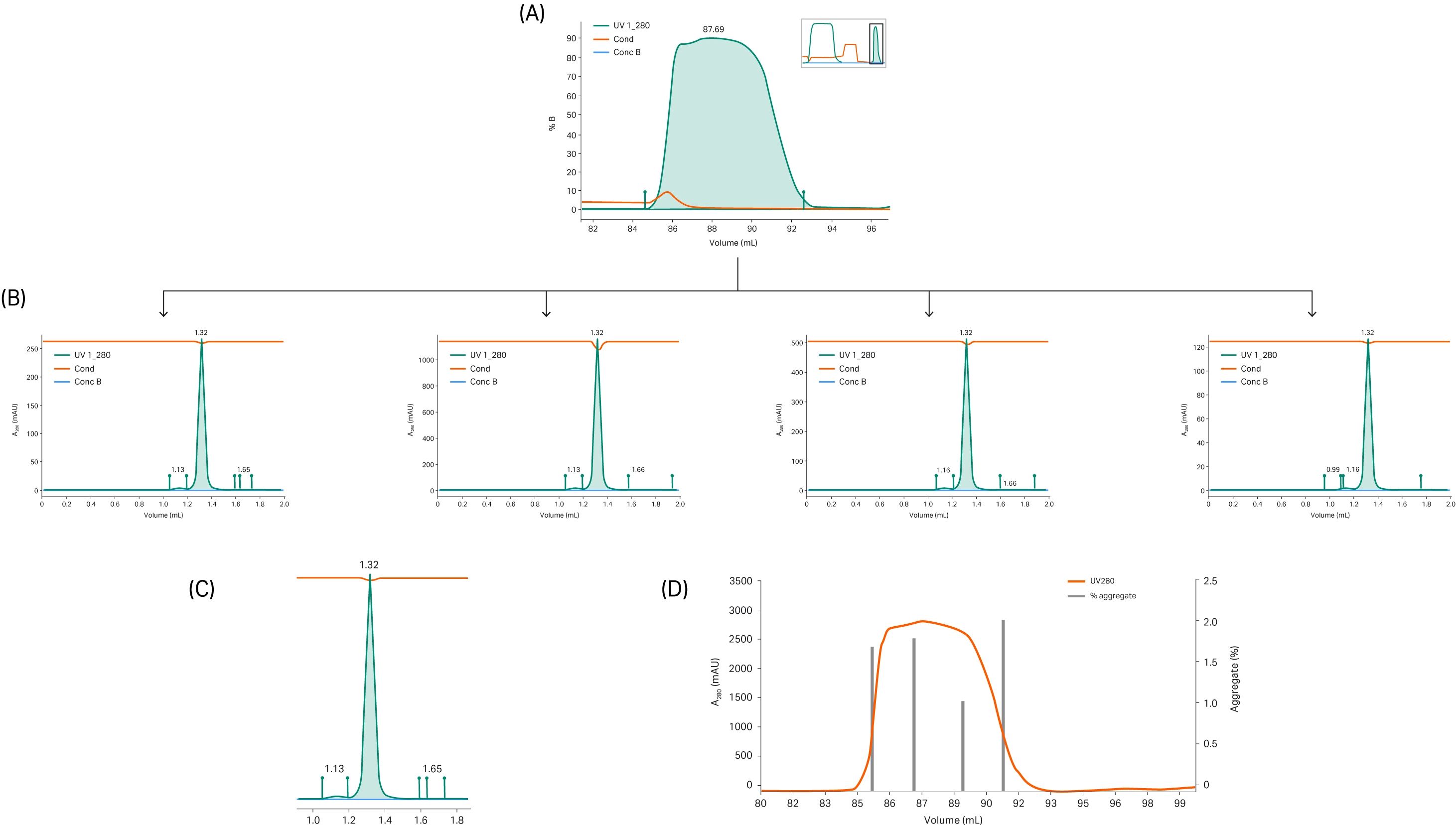 To evaluate aggregate content, samples from every other fraction covering this peak were analyzed with analytical SEC (Fig 4). Peaks were integrated and aggregate content was estimated to < 2% for fractions collected between 110 to 125 mL.