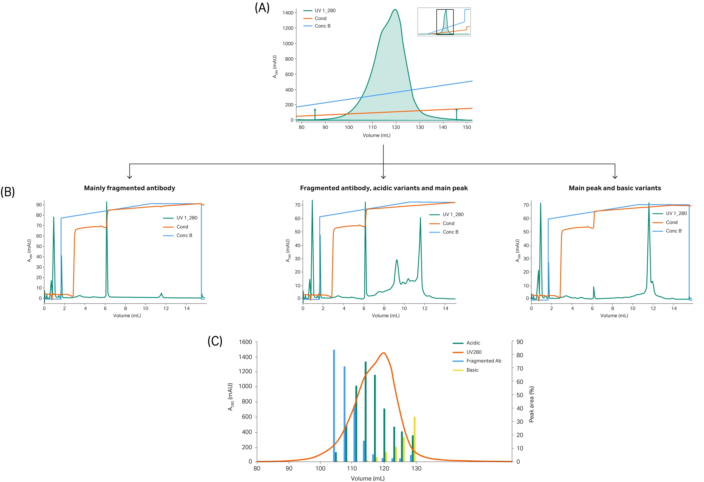 Fig 6. a) Chromatogram showing the IEX purification. b) Three fractions from the main peak after IEX were analyzed. Based on previous data (not shown) this peak usually consists of fragments, acidic, main peak, and basic variants. c) The distribution and amount (%) of these variants (aggregates in blue, acidic in green and basic in yellow) is shown in the bottom chromatogram.