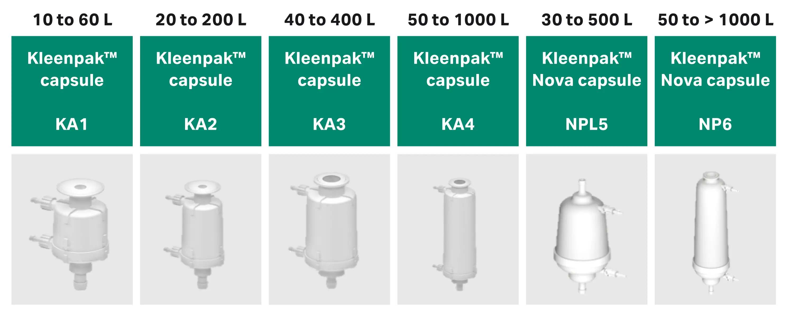Fig 3. Filter size range with indicative batch volume ranges, that were used in both single and redundant filtration configurations.