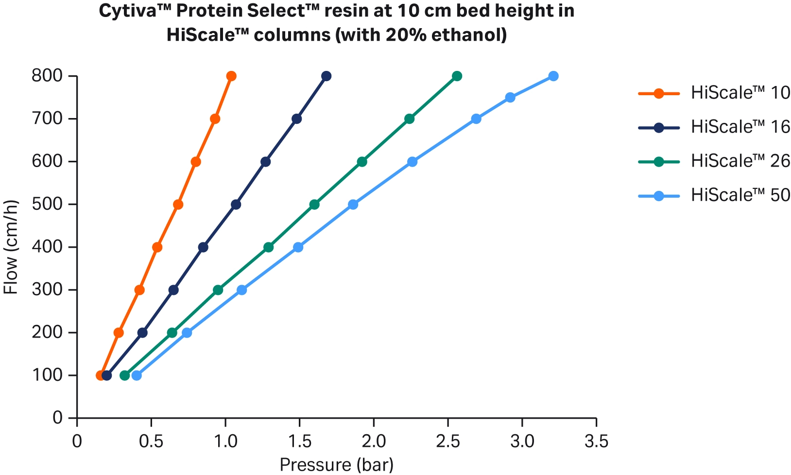 Fig 2. Pressure flow curves with 20% ethanol for Cytiva™ Protein Select™ resin in HiScale™ columns at 10 cm bed height. 1 bar = 0.1 MPa = 14.5 psi (20% ethanol was used to simulate a sample i.e., viscosity similar to an E. coli lysate)