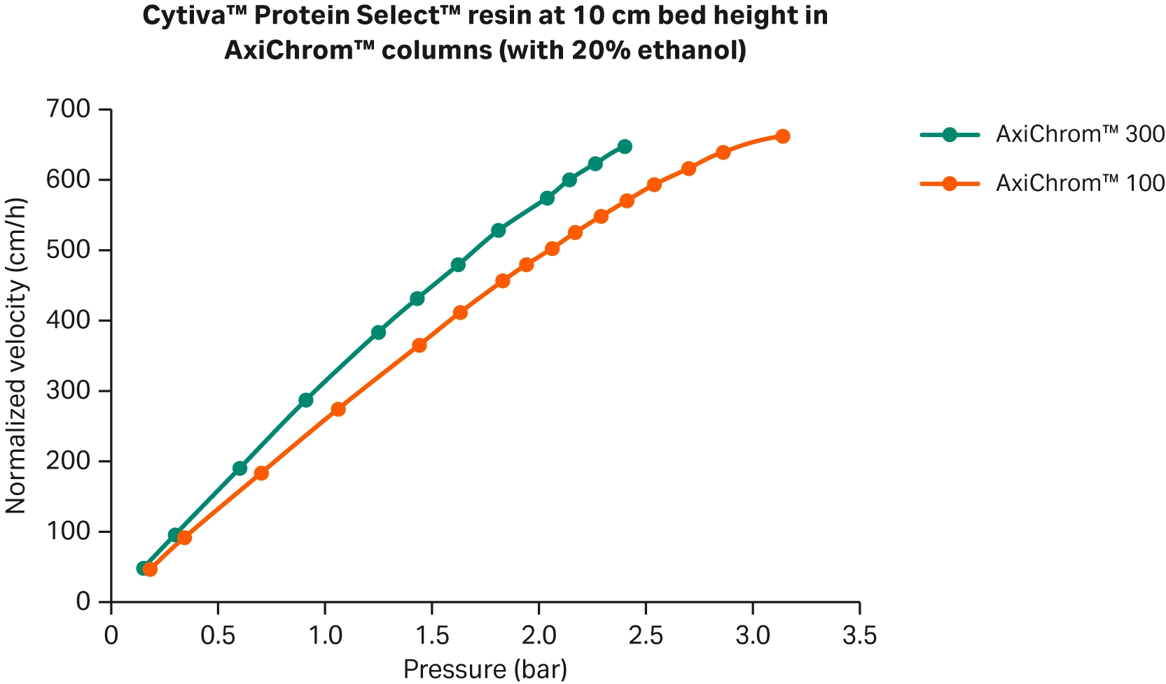 Fig 1. Pressure flow curves with 20% ethanol for Cytiva™ Protein Select™ resin in AxiChrom™ 100 and 300 columns, normalized to 10 cm bed height and 20°C. 1 bar = 0.1 MPa = 14.5 psi (20% ethanol was used to simulate a sample i.e, viscosity similar to an E. coli lysate)