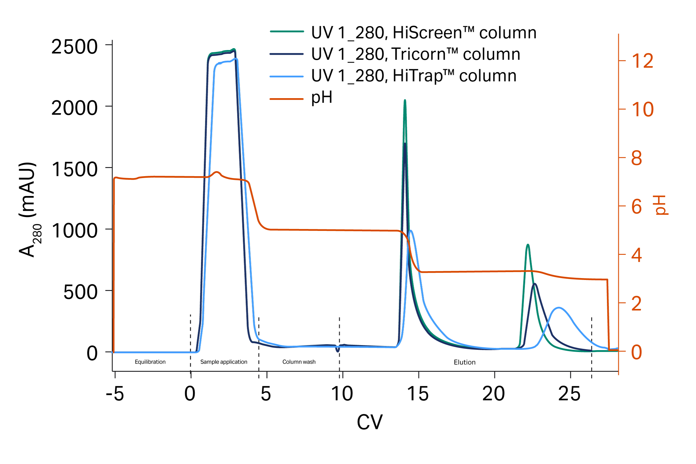 • The resolution in a step pH elution with MabSelect™ VL is comparable for the different column formats (Tricorn™ 5/100, HiTrap™ 1 mL, and HiScreen™) investigated in this study. The elution peaks for HiTrap™ 1 mL were slightly delayed and broader compared to the other two columns. This is expected due to the smaller resin volume relative the void volume of the ÄKTA pure™ system compared to the other column formats. All three column formats result in baseline separation of the bsAb and the kappa homodimer.
