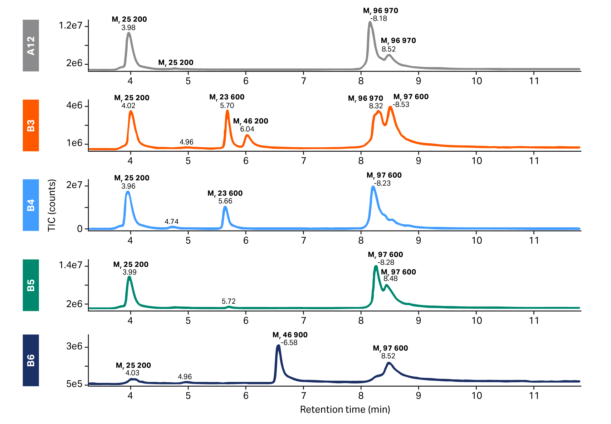 The samples used in the gradient and step elution runs were treated before LC-MS analysis with FabRICATOR® (IdeS, Genovis AB). Fc/2 fragment were present in all fractions and corresponded to the peak molecular weight (Mr) of approximately 25 000 (Fig 6). Fraction A12 was composed of a main peak of approximately Mr 97 000 which matched the MW of the bsAb. Fraction B3 contained the bsAb (Mr 96 970) and the kappa homodimer (Mr 97 600) but also smaller fragments (Mr 23 600 and 46 200) which are likely variable light change (VL) and dimerized VL. The remaining fractions (B4, B5, and B6) contained only the kappa homodimer and no bsAb. Fragments, such as VL and dimerized VL, were present in fractions B4 and B6, respectively.
