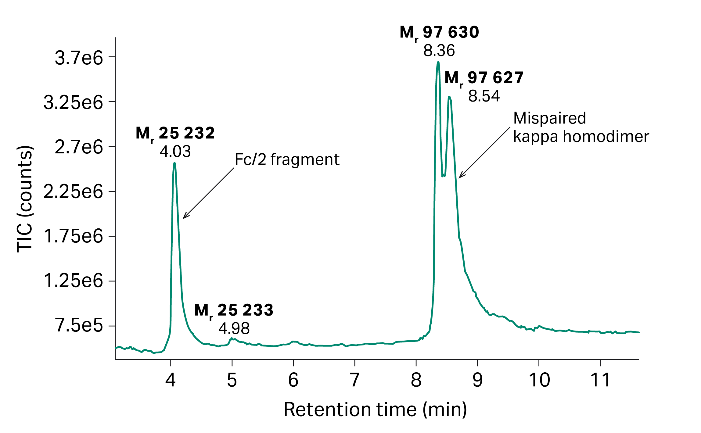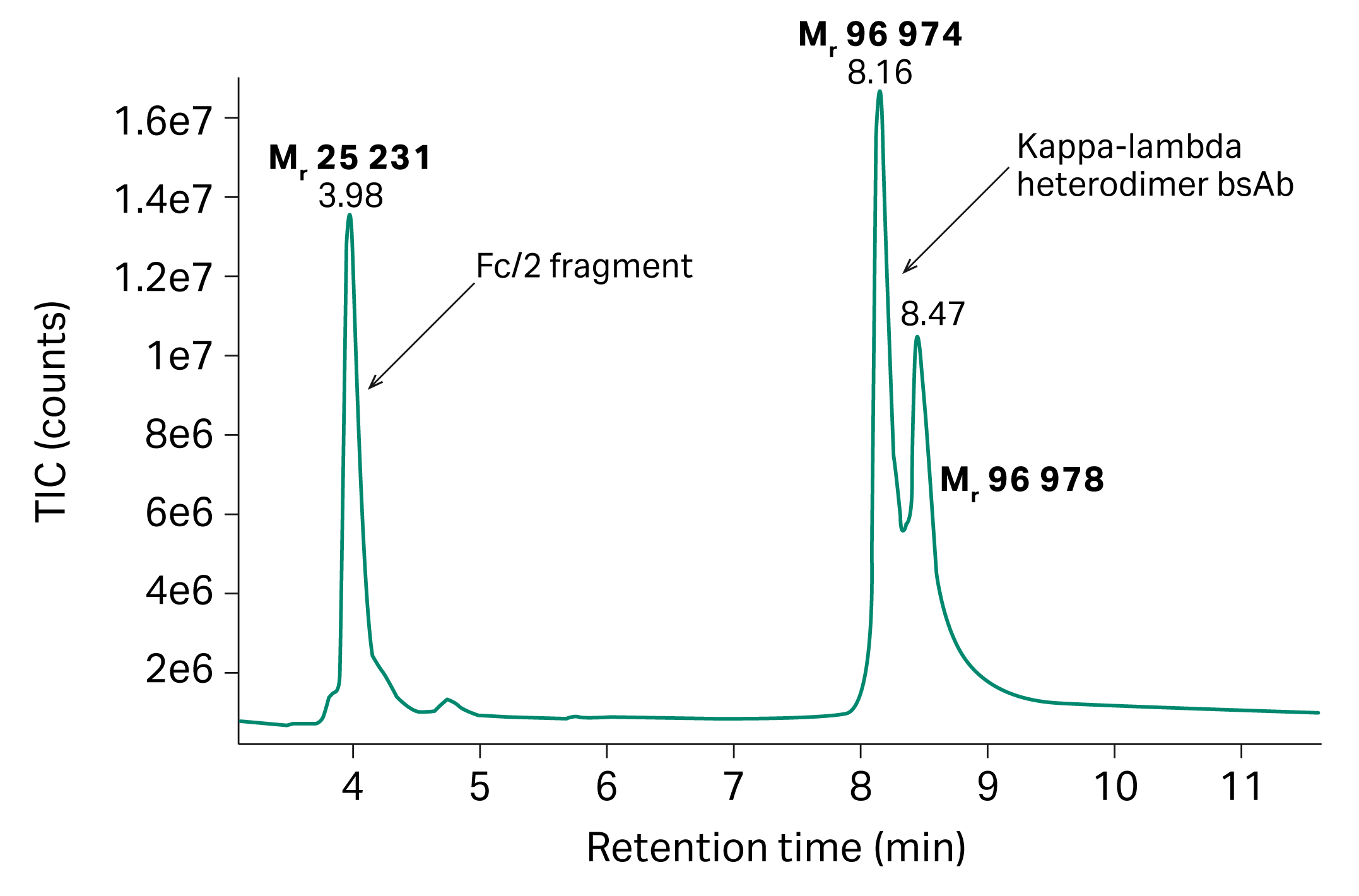 The results show that the mispaired kappa homodimer and the kappa-lambda heterodimer bispecific mAb are separated well which can be seen in the Mr of 97000 and 97600 separation in LC-MS from the different elution fractions. The data also shows that the bsAb can not only be purified from the kappa homodimer but also separated from the single and dimerized VL in the sample.