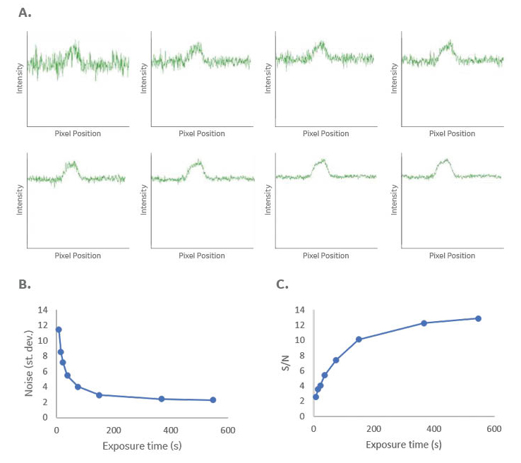 Fig 1. Image capture and averaging by SNOW algorithm reduces noise to maximize S/N. (A) Line profiles from continuously averaged 7.5 s exposures with SNOW algorithm, from first capture to the average after capture 73, shown by (B) a reduction in noise and stable signal and resulting in (C) an increase in S/N.