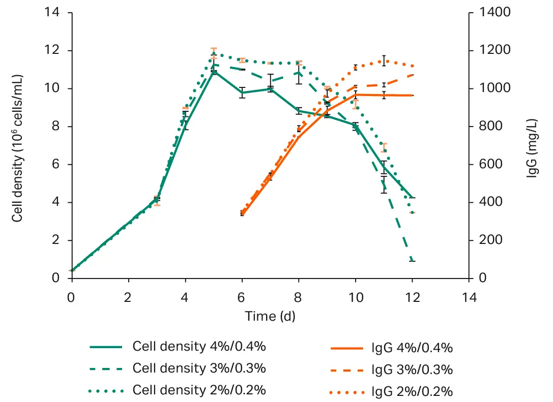 In this application note, we show the development of a fed-batch process for a low-producing CHO cell line, using ActiPro™ culture medium and supplements. We assessed feed ratios of 2.0%/0.2%, 3.0%/0.3%, and 4.0%/0.4% Cell Boost™ supplements 7a to 7b. For this cell line, we found that optimal cell growth and productivity was obtained at 2% Cell Boost™ supplement 7a and 0.2% Cell Boost™ supplement 7b. Our results reflect the importance of determining appropriate feeding regimen based on the nutritional requirements of a specific cell line, to avoid over or under feeding of the culture. As charge variants and glycoform distribution can vary significantly between and during the cultures depending on selected feeding strategy, you should consider these important product quality parameters when selecting feeding strategy and scaling up the process.