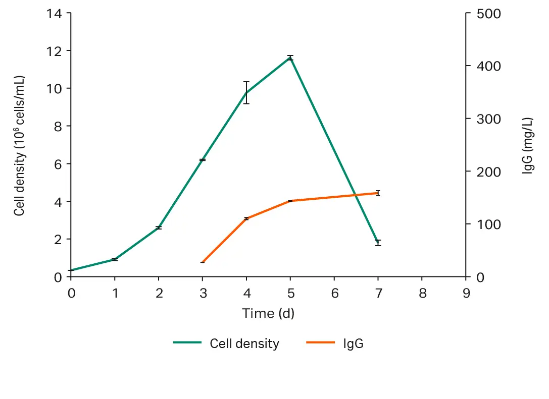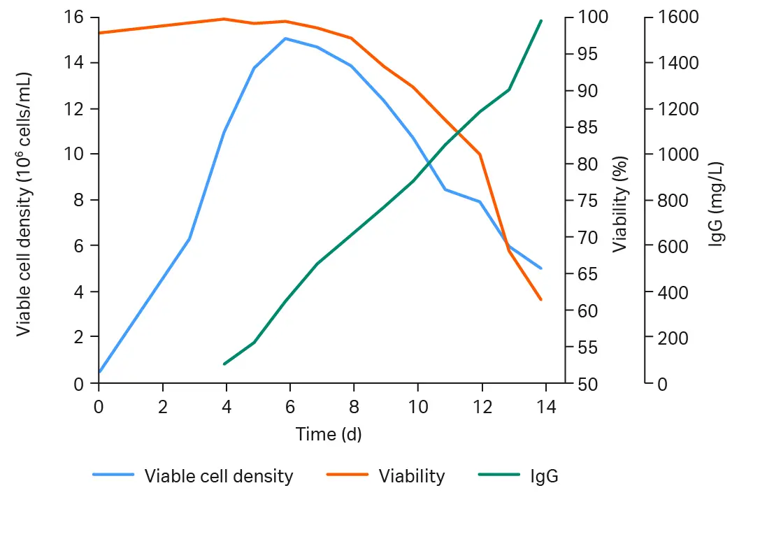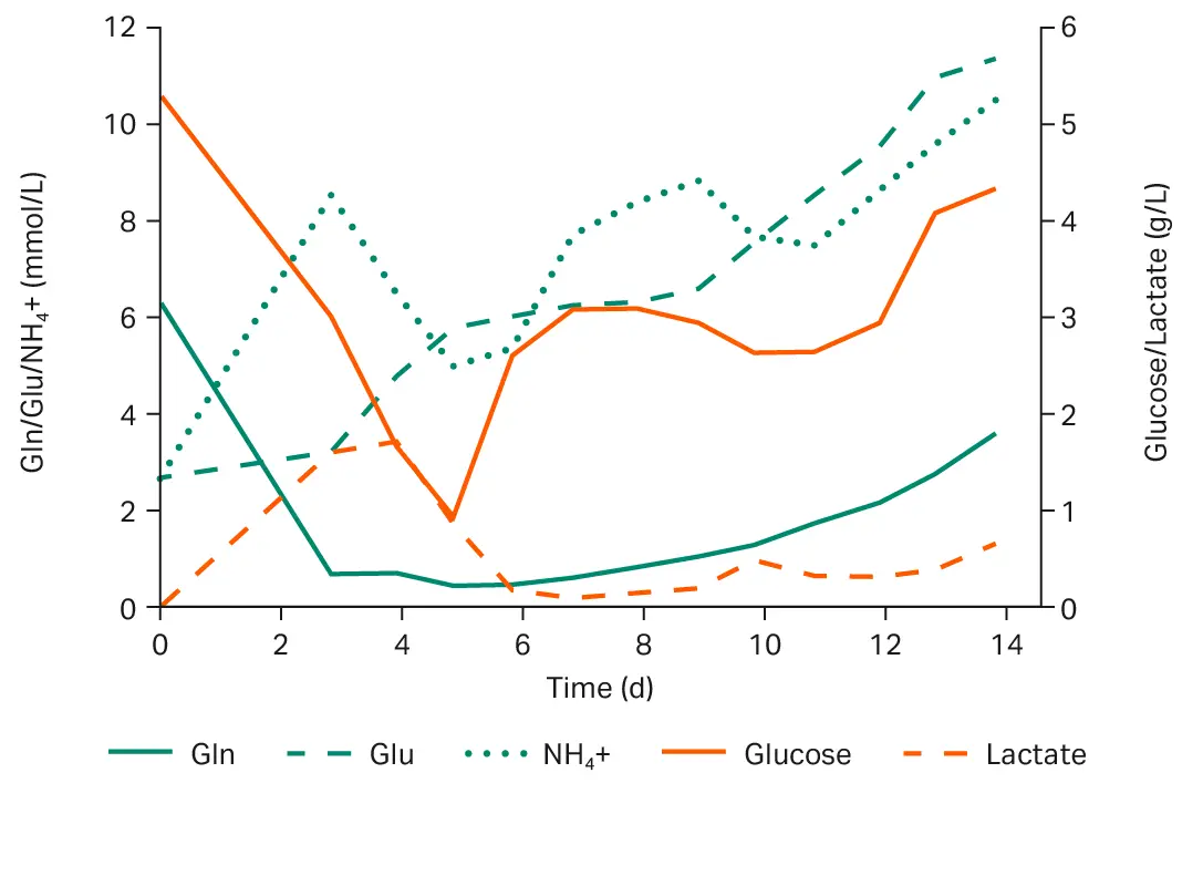 We measured cell density and viability, glucose, lactate, ammonium, glutamine, glutamate levels in cell suspension using a Bioprofile FLEX analyzer. The amount of produced mAb was measured in clarified culture feed with a CEDEX Bio analyzer. Glycoanalysis was performed by Cobra Biologics Ltd., Staffordshire, UK. Charge variant distribution was determined by cation exchange chromatography on a ProPac WCX-10 2 × 250 mm protein column.