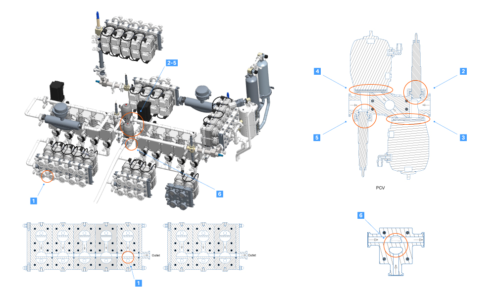 Fig 1. Swab samples were collected from inlet A (1), the pressure control valve (PCV) (2 through 5), and inline dilution inlet (6).