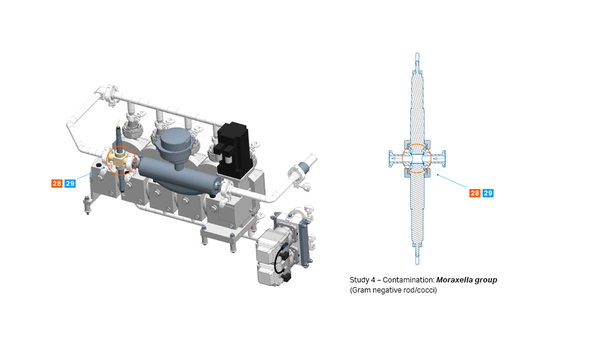 Among the 29 swab samples taken, one of the samples (27) proved to be positive for the challenging organism S. aureus, which means that the acceptance criteria were not met. The challenging organism was found in outlet valve number 10, which shows that those valve types easily can hold on to this type of cocci shaped organisms. Contaminants other than the challenging organism were also found in one of the membrane valves positioned in the process control valve (PCV) component and in one of the valves related to filter unit two. Organisms found here were Ralstonia mannitolilytica and Stenotrophomonas maltophilia, respectively. Contaminants were also found at two other positions (8 and 24). The first position was the downward pointing pressure sensor and the second one the horizontal positioned conductivity cells closest to the outlet valves. Organisms found were Staphylococcus haemolyticus and Burkholderia cepacian, respectively, common among the human flora of bacteria. Those two contaminants were false positives and likely to be related to compromised aseptic handling. The same reasoning goes for the other two contaminants at positions 3 and 13, respectively.