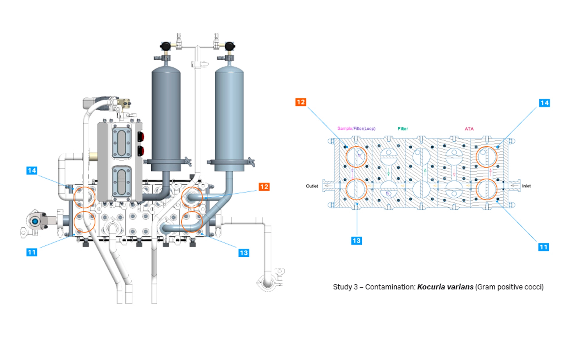 Fig 3. Swab samples were collected from wetted membrane directing flow to the air trap, filter, and sample valves (11 through 14). Contamination was detected from sample 12 in study 3.