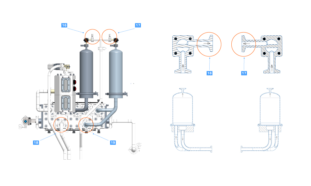 3 Pressure control valve  Wetted part of EPDM membrane of valve, directed downward. Test method 3 swab test  18 Air trap and filter valve block Wetted part of EPDM membrane of GEMÜ valve position 4  Test method 3 swab test