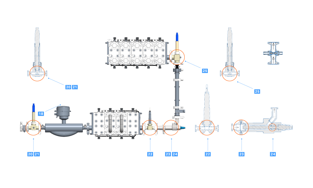 Fig 6. Swab samples were collected from the pH (vertical) and pressure sensor (horizontal) (20, 21), pressure sensor (vertical) (22), conductivity sensor (horizontal) (23 and 24), and pH sensor (25).