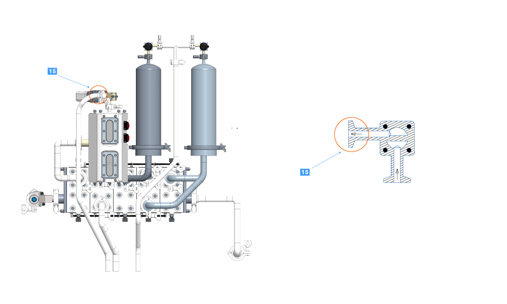 2 Pressure control valve Tip of pressure sensor, directed upward. Test method 3 swab test  17 Filter units top valve Horizontal valve channel, filter unit 2, pointing to the left.   Test method 3 swab test