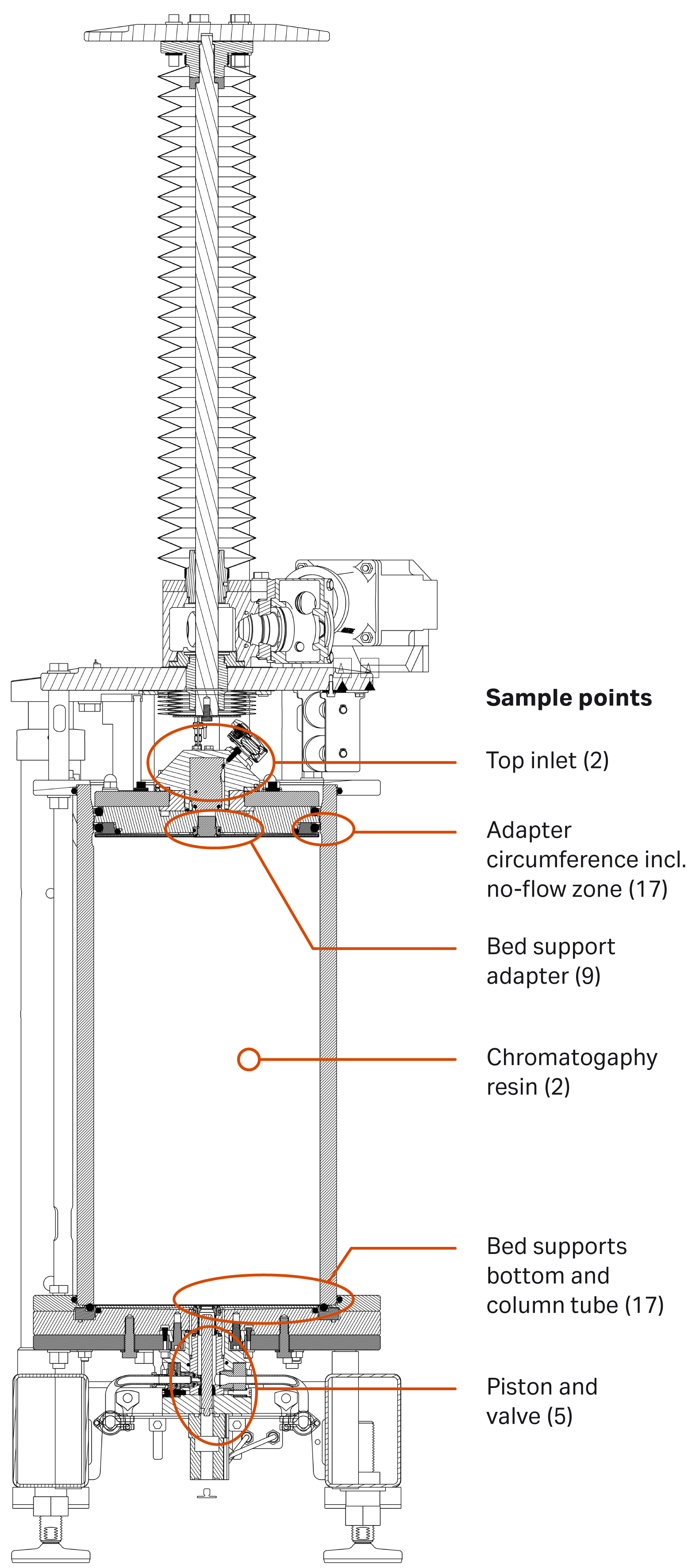 An AxiChrom™ 300 column with new and unused acrylic tube and stainless-steel bed supports was the starting point for our study. The bottom and top bed support net (10 µm) were of the latest design, which includes the 273 × 2.62 mm EPDM O-ring (29165936) for sealing off the interface between the top plate and the adapter. All O-rings in contact with the process stream and directly or indirectly connected to a sampling point were replaced with new ones.