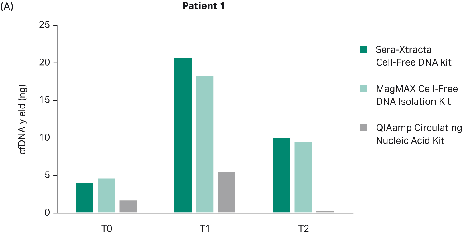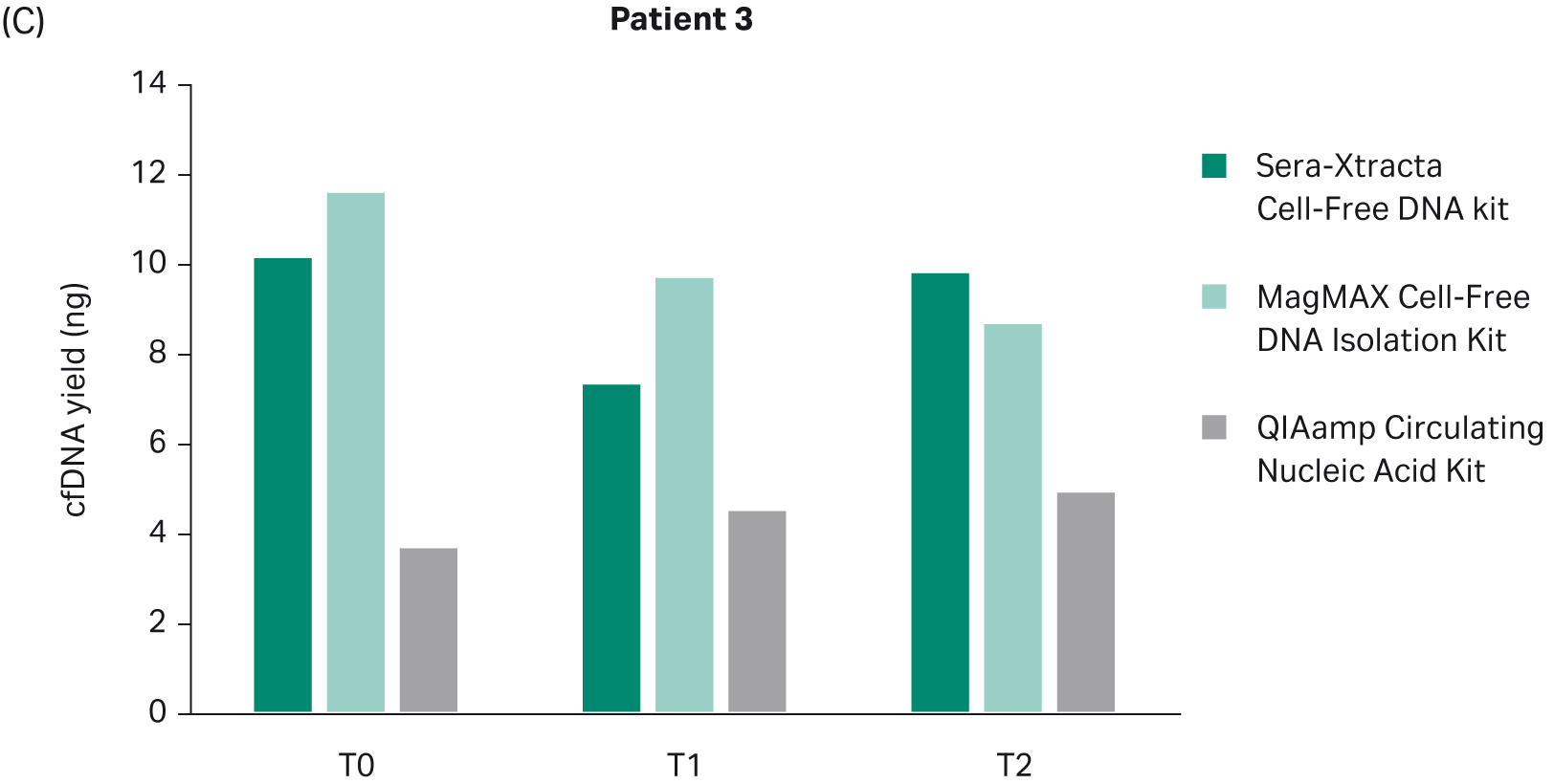 Fig 2. Total DNA yield, quantified using Qubit, at T0-T2: bar chart summarizing total DNA yield obtained from 1 mL of plasma processed with three extraction kits: Sera-Xtracta Cell-Free DNA Kit, MagMAX Cell-Free DNA Isolation Kit and QIAamp Circulating Nucleic Acid Kit.