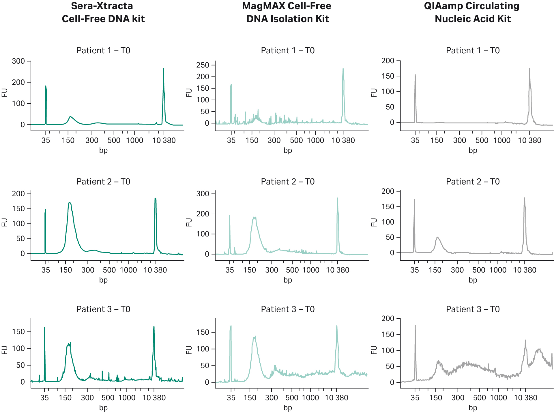 Fig 3. cfDNA recovery and size distribution from plasma at T0: representative electropherograms showing DNA fragment distribution obtained from plasma at T0 (baseline). 1 mL of plasma was independently processed with three extraction kits: Sera-Xtracta Cell-Free DNA Kit and MagMAX Cell-Free DNA Isolation Kit and QIAamp Circulating Nucleic Acid Kit following the manufacturers’ protocol (note that no carrier RNA was added to buffer ACL in the Qiagen workflow). Extracted samples were analyzed on 2100 Bioanalyzer using High-Sensitivity DNA Chip.