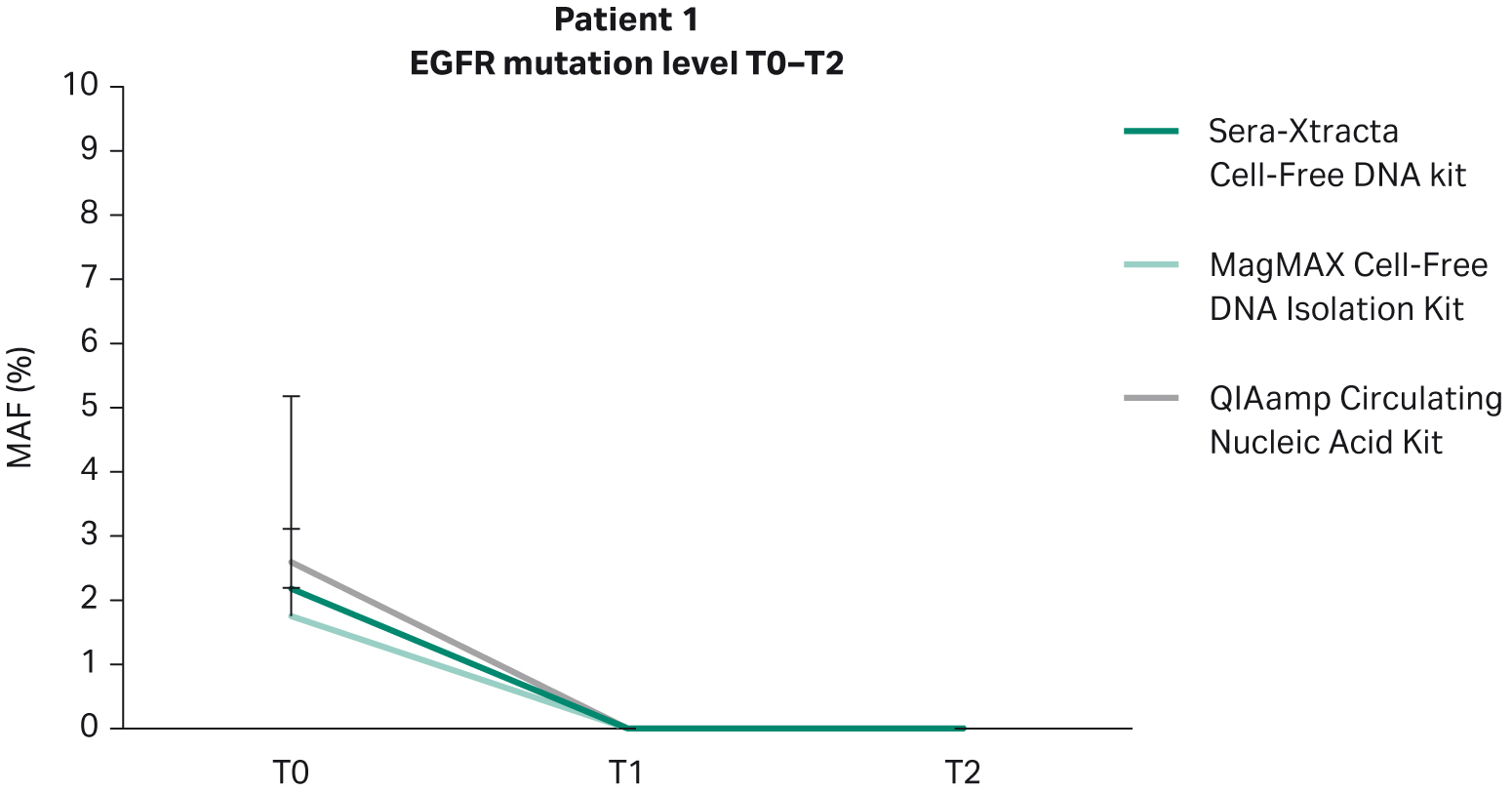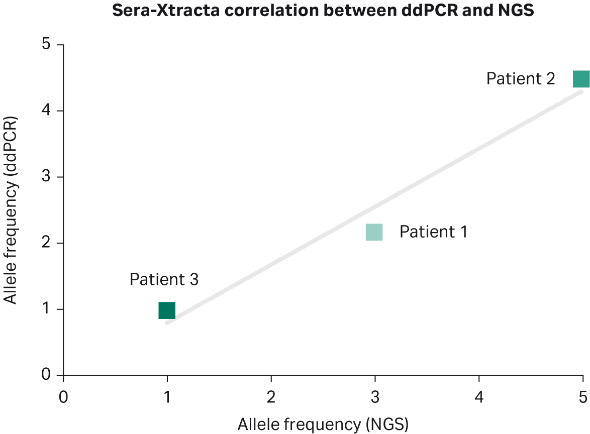 This study evaluated the use of cfDNA for biomarker profiling in a clinically relevant setting and highlighted the impact that the cfDNA extraction method can have on the sensitivity of biomarker detection and ultimately on patient outcomes. From three extraction methods tested, only samples processed with Sera-Xtracta Cell-Free DNA Kit showed 100% concordance with tissue biopsy results, allowing for confirmation of the presence of EGFR driver mutation in all patients at baseline. This report further demonstrated that with the Sera-Xtracta Cell-Free DNA Kit, the same sensitivity can be achieved when using an alternative detection method (ddPCR) with an extremely high correlation in MAF between NGS and ddPCR.