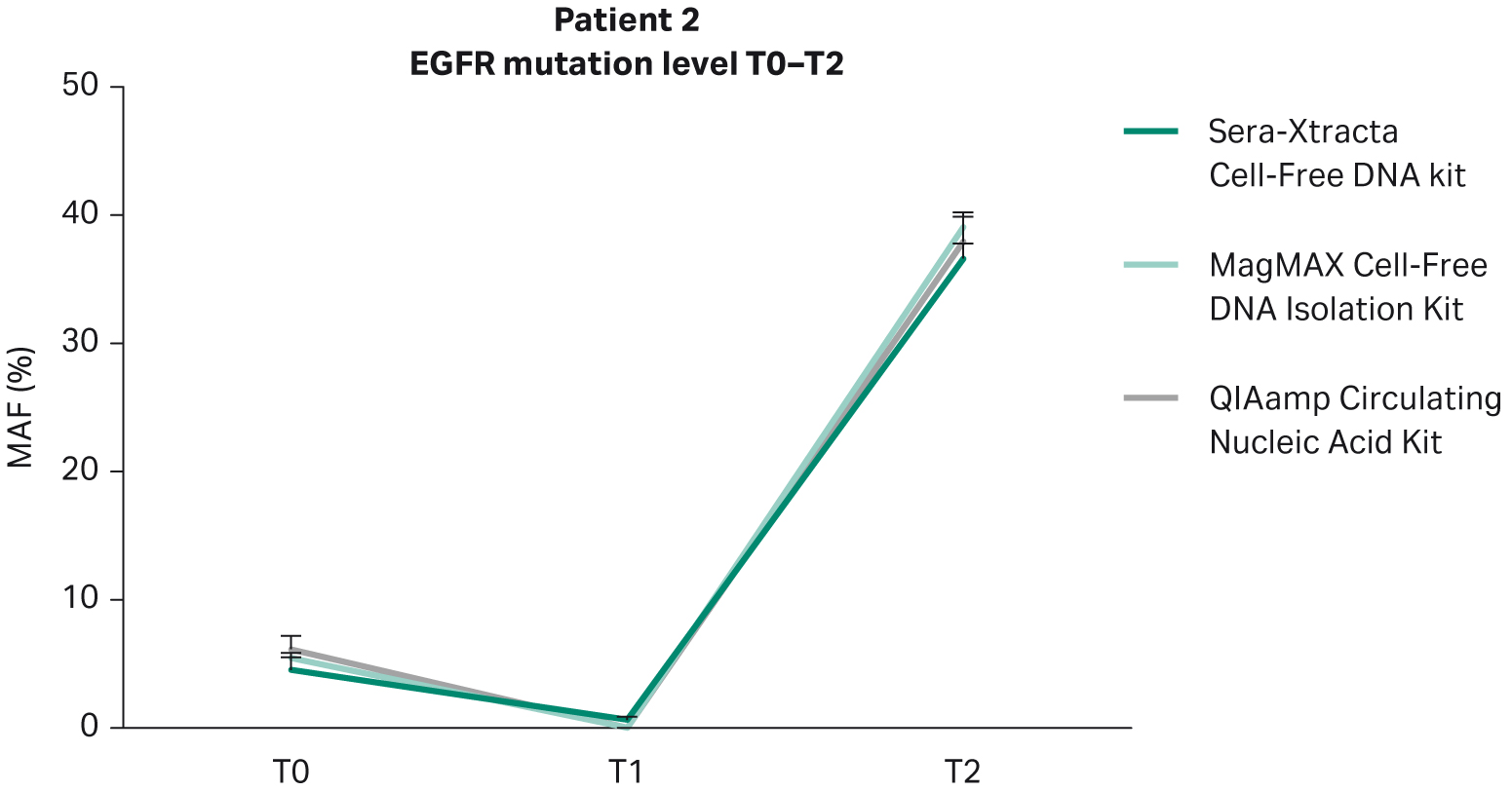 Based on clinical data provided, Patient 2 did not respond to targeted therapy and presented with progressive disease. This is in agreement with the findings from plasma: in all samples extracted with the Sera-Xtracta Cell-Free DNA Kit, the presence of primary EGFR driver mutation was confirmed at all time points investigated albeit at different levels (Table 8). At baseline (T0) MAF was estimated to be around 5%. Although the level of MAF decreased to 1% at 11 weeks indicative of a decline in tumor burden, the treatment was not effective, and the disease progressed rapidly (MAF at 37% at T2; 31 weeks) (Fig 6).