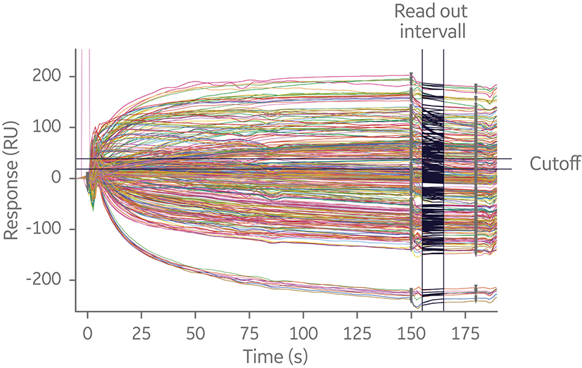 Fig 7. Sensorgram overlay of sandwich 20 × 20 SPR assay. The experiment utilized a capture antibody assay format to minimize time spent on assay development. Independent of where in the screening process epitope binning is performed, analyzing many interactions is time-consuming.