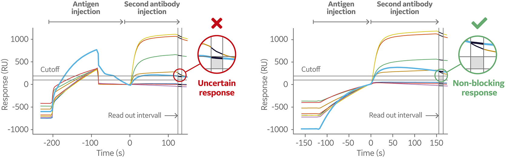 Fig 3. Sensorgram illustrating the outcome of a sandwich assay with a non-blocking (blue) and blocking response (orange) from pairwise testing of two antibodies to an antigen. The first antibody was pre-immobilized to the sensor chip surface (not shown).