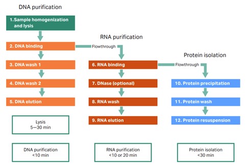 Fig 2. TriplePrep workflow. From sample to DNA,RNA, and protein in less than 60 min.