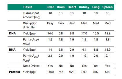 Table 1. Typical yield and purities of genomic DNA, total RNA, and total protein from various tissues