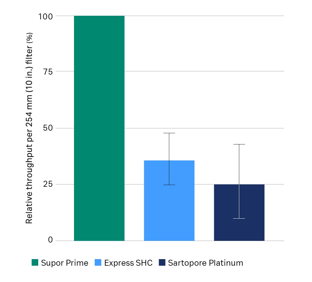Fig 3b. Average relative throughput performance per 254 mm (10 in.) filter. Each data point scaled up using published filtration areas. Error bars represent one standard deviation of the mean. The difference in the mean is highly significant (p<0.01) for Express SHC (n=17) and Sartopore Platinum (n=17) using a two-tailed paired Student’s t-test. Results for individual feeds will vary.