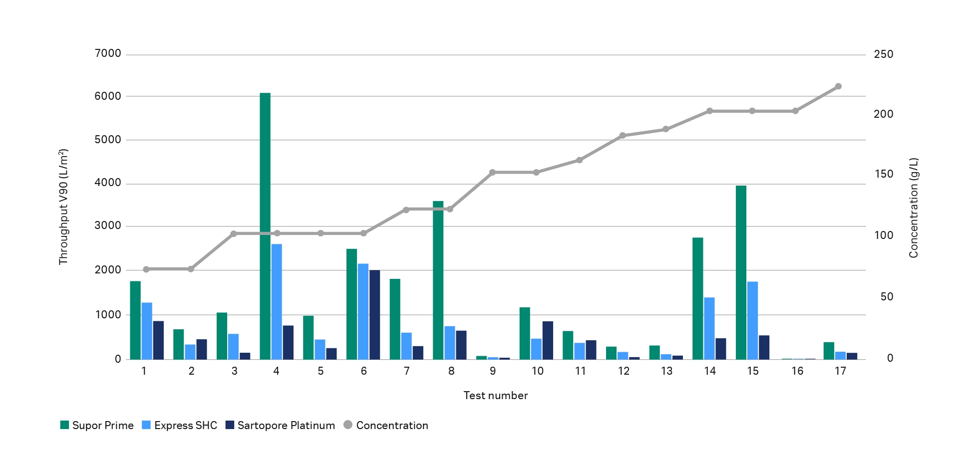 We performed filter throughput testing using 17 fluids with antibody concentrations ranging from 70 to 220 g/L. Of these fluids, 14 were supplied by end-users and a further 3 were tested from a bank of internal test fluids. Details of each fluid and filter test format used in the study are shown in Appendix 1.