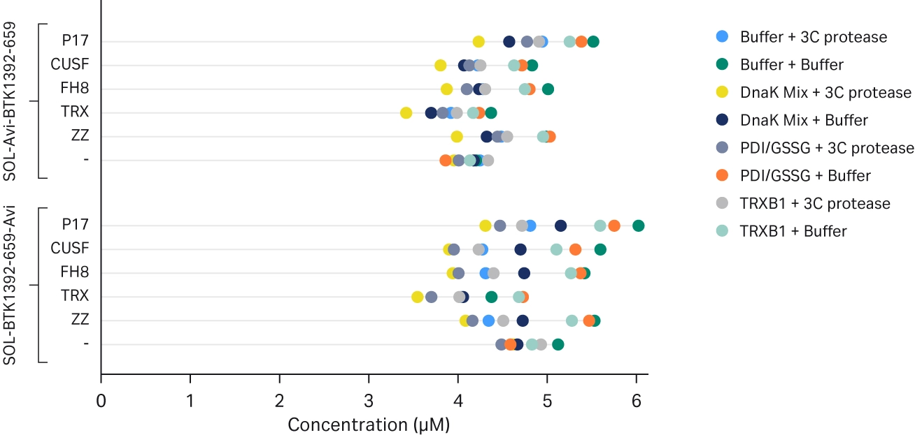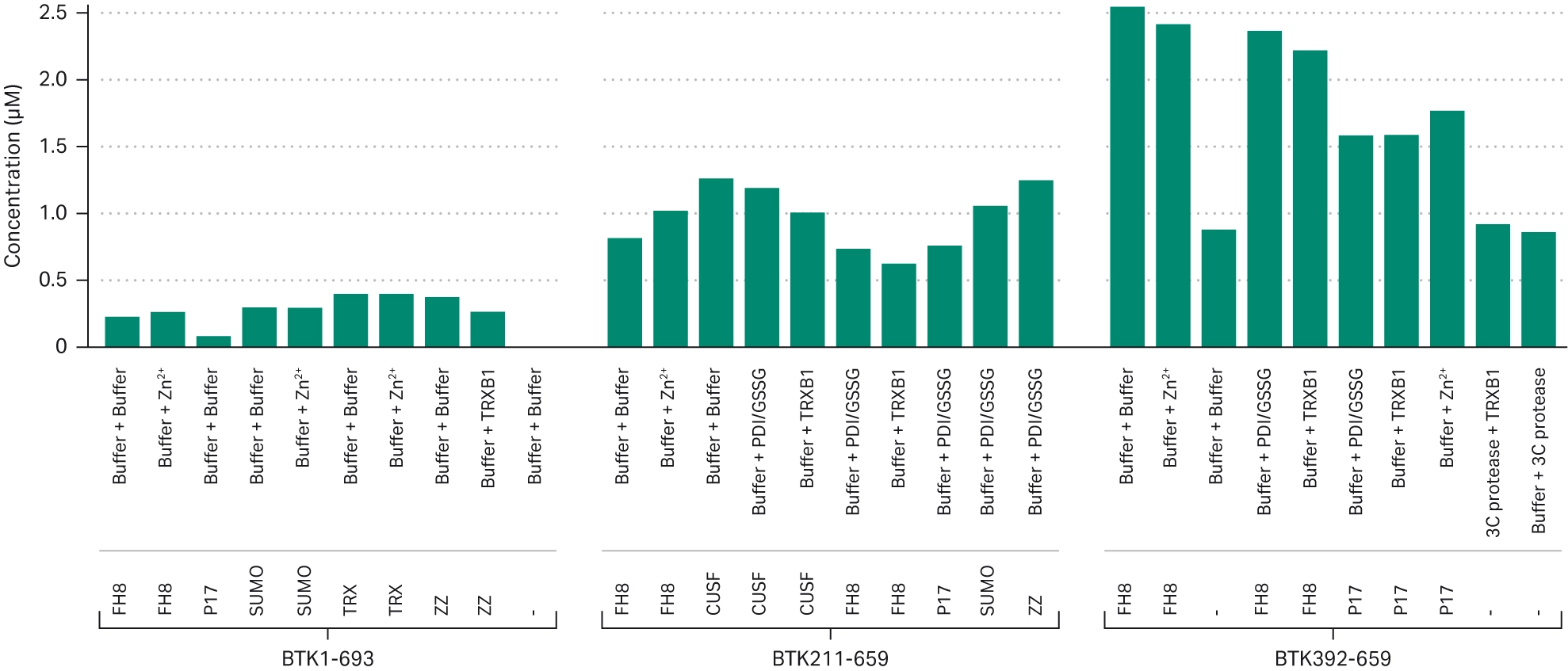 Avi-tags were introduced to the N- or C-terminus of BTK392-659 (Figure 3A) to assess their impact on protein production. A slight drop in expression yield was observed from 6-8 µM (Figure 2B) to 5-6 µM (Figure 3B). However, Avi-tag placement did not adversely affect expression and purification, with a predicted purified yield of 2.5 µM for both (Figure 3C). Buffer alone remained the best additive, but in this case, the ZZ solubility tag maximized yield rather than FH8, reinforcing the importance of solubility tag screening.
