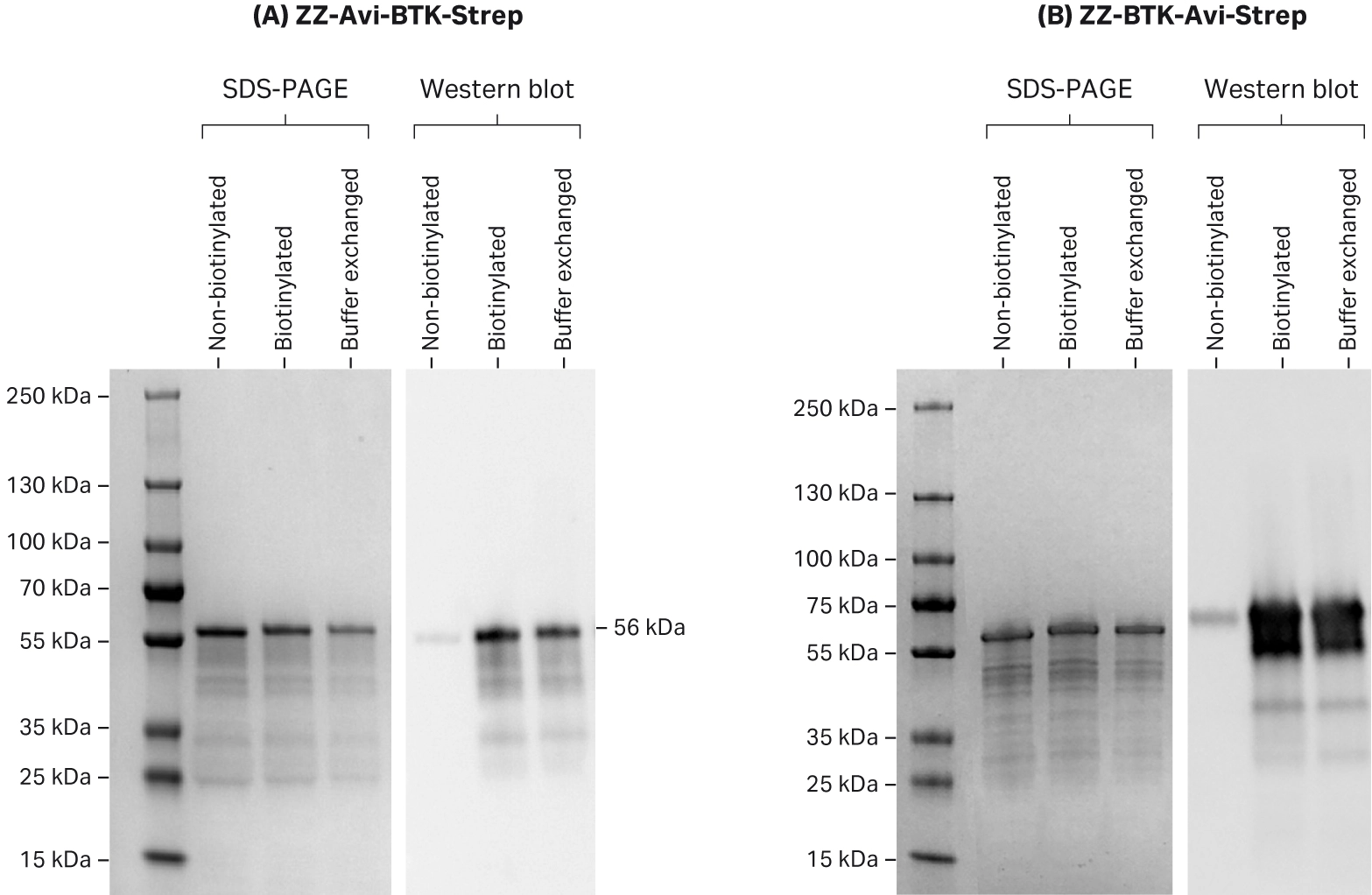 Figure 5. Western blot analysis of N- and C-terminal Avi-tagged BTK(BTK (392-659) biotinylation using Streptavidin-A488. (A) N-terminal Avi-tagged BTK and (B) C-terminal Avi-tagged BTK analyzed at different stages of biotinylation: non-biotinylated, biotinylated and after buffer exchange.
