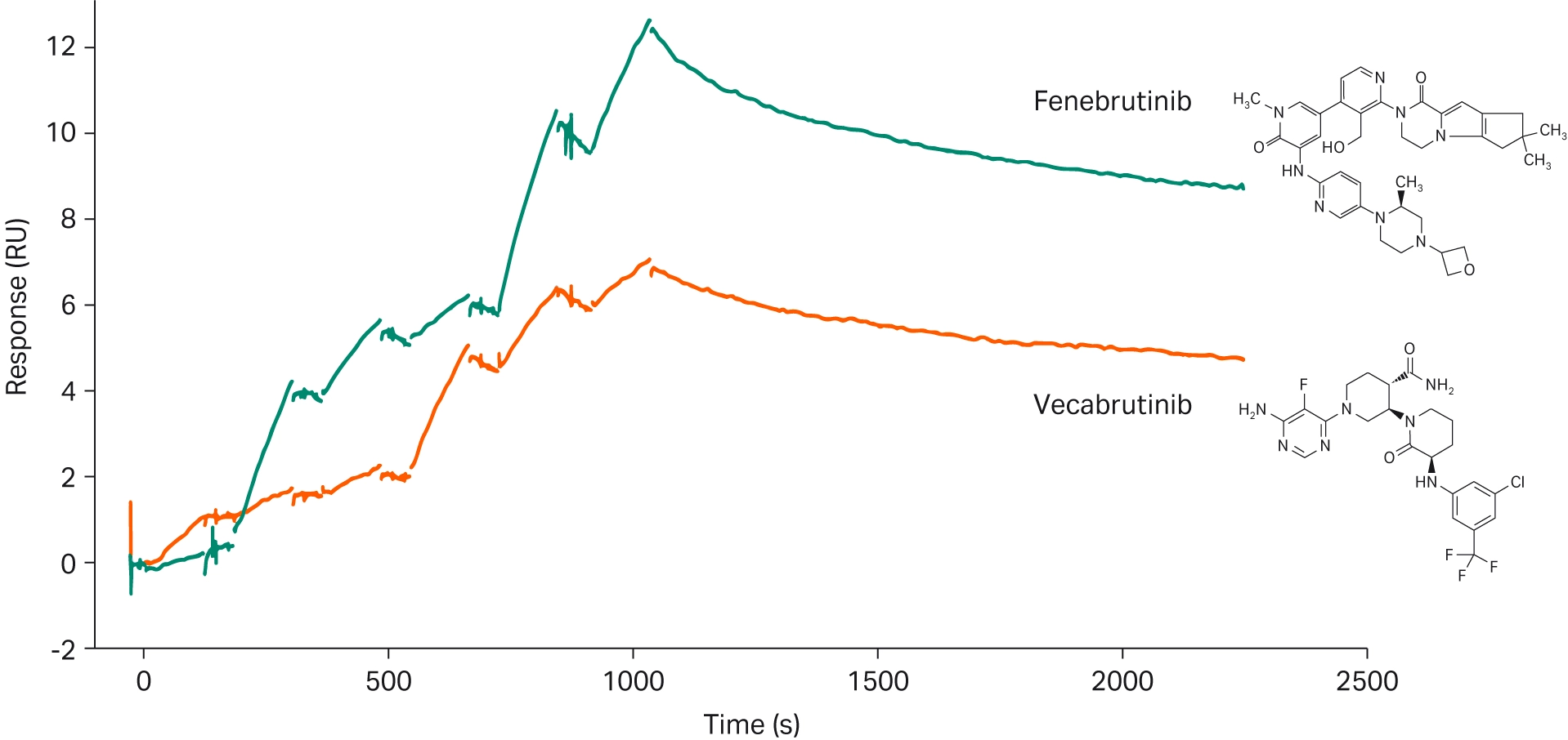 Figure 6. (A) Biacore™ SPR sensorgrams of N- and C-terminal Avi-tagged BTK (392-659) variants captured on Sensor Chip SA. (B) Biacore Single-Cycle Kinetics (SCK) sensorgrams of fenebrutinib and vecabrutinib (0.4–100 nM) binding to N-terminal biotinylated BTK [SOL-Avi-BTK(392-659)].