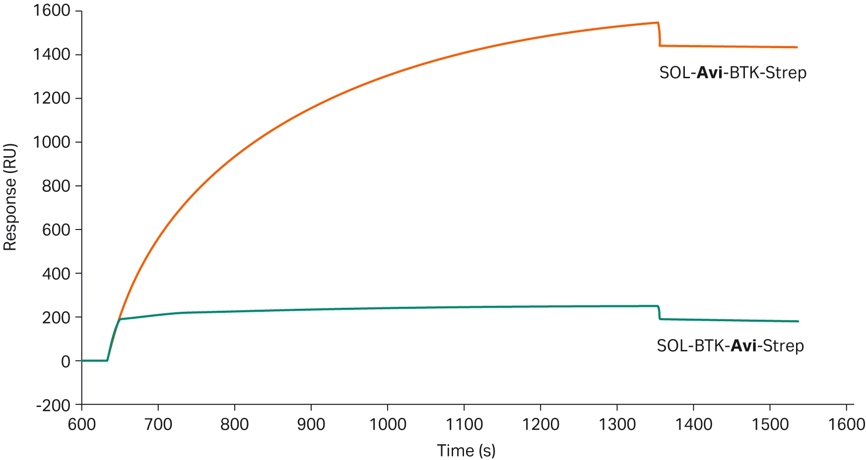 BTK with N-terminal biotinylation exhibited good capture levels on both sensor chips, while C-terminal biotinylation resulted in poor binding levels, likely due to steric hindrance. Similar capture levels were observed on Sensor chip NA (data not shown). This simple Biacore™ capture assay provides quick insights into the importance of empirical tag placement optimization.