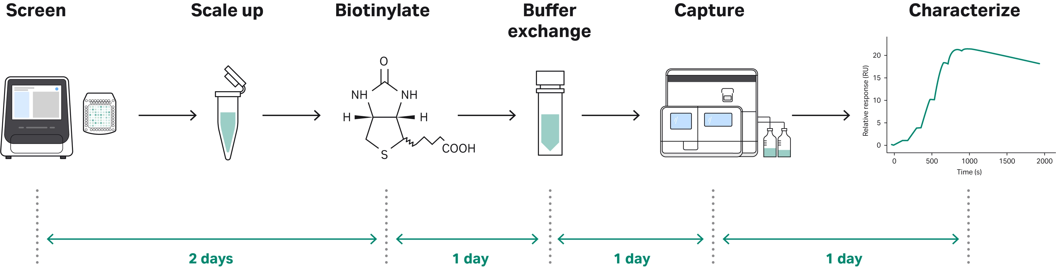 Figure 1. DNA to protein characterization in a five-day workflow. Proteins are screened for optimal expression and purification using the eProtein Discovery™ system, which integrates digital microfluidics and cell-free protein synthesis. The best conditions are scaled up and biotinylated. Excess biotin in the sample is removed via buffer exchange before Biacore™ SPR analysis. Biotinylated proteins are then directly captured on Sensor Chip SA (Streptavidin) for characterization of drug-target interactions using Biacore 1S+ system.