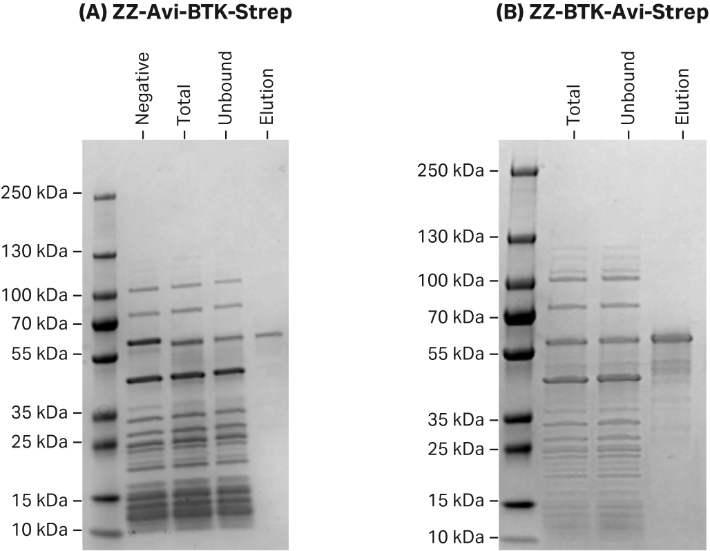 Figure 4. SDS-PAGE analysis of scaled-up Avi-tagged BTK(BTK (392-659) using the eProtein Discovery™ system. (A) N-terminal Avi-tagged BTK and (B) C-terminal Avi-tagged BTK, both expressed with the ZZ solubility tag and buffer-only conditions.