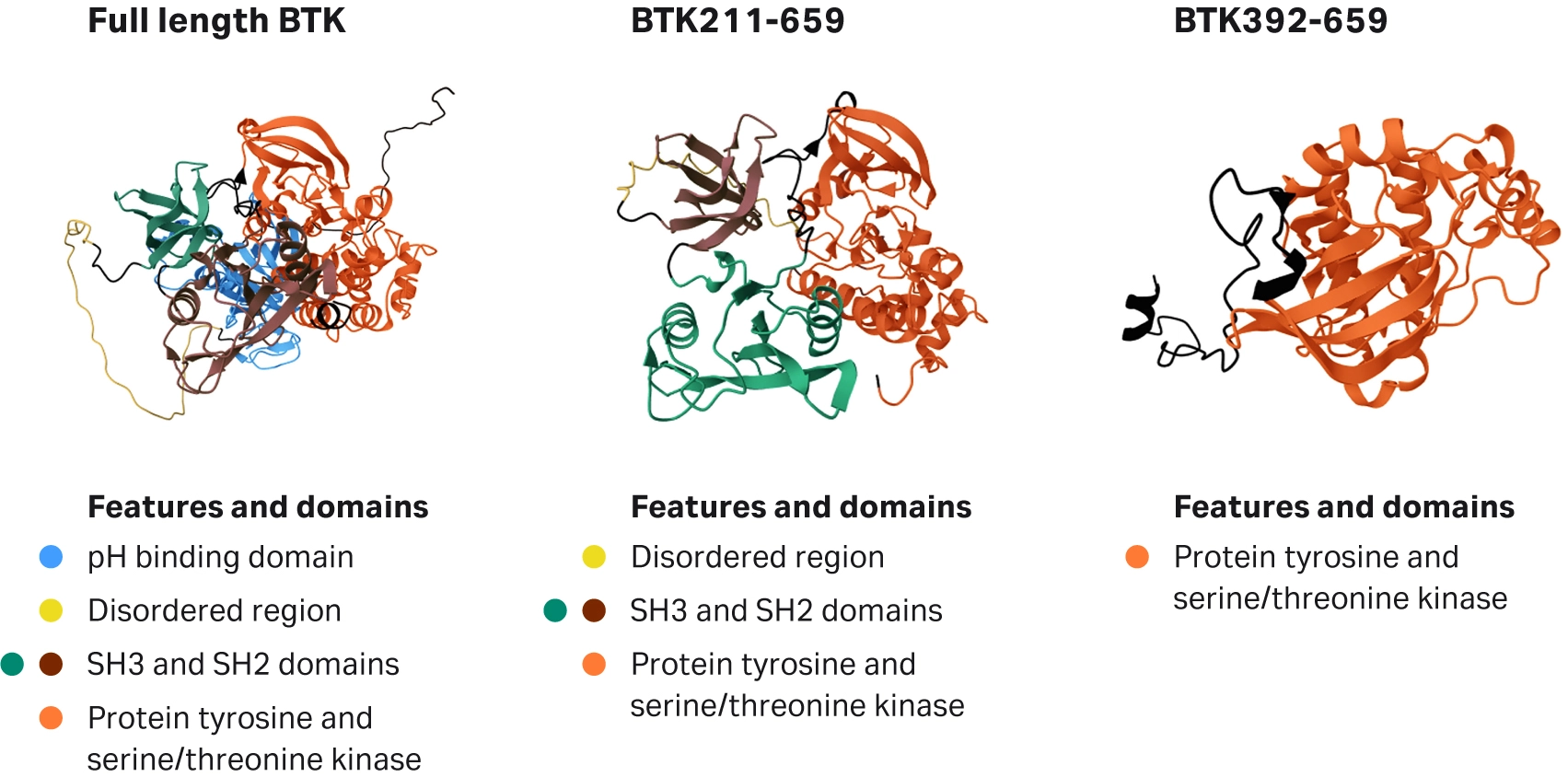 To evaluate the expression of BTK, three BTK constructs were designed using integrated AlphaFold (Figure 2A) and screened against a panel of solubility tags and Cell-free Blends using the eProtein Discovery system™. The BTK kinase domain alone variant, BTK392-659, with an FH8 solubility tag, exhibited a nine-fold increase in expression over full length BTK (Figure 2B). Purification efficiency followed a similar trend, with BTK392-659 producing five-fold more purified protein than full-length BTK (Figure 2C), demonstrating the power of construct optimization in maximizing protein yield and stability.