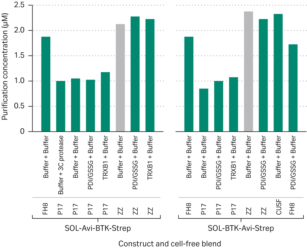 Both Avi-tagged BTK392-659 variants containing the ZZ solubility tag were scaled up using buffer-only Cell-free Blends, yielding 250 µg/mL of purified protein (Figure 4). The eProtein Discovery™ screen successfully optimized Avi-tagged BTK production, accelerating scale-up for downstream functional studies. Additionally, these findings confirm that additional functional tags, such as Avi-tags, can be incorporated into gene fragments for production with the eProtein Discovery™ system.