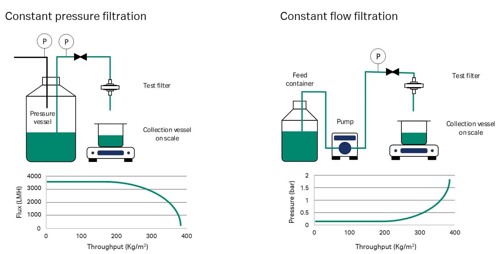 Fig 1. Comparison of constant pressure filtration vs constant flow filtration setup. For constant pressure filtration, throughput is assessed based on flux decline, whereas for constant flow filtration, throughput is assessed based on pressure increase.