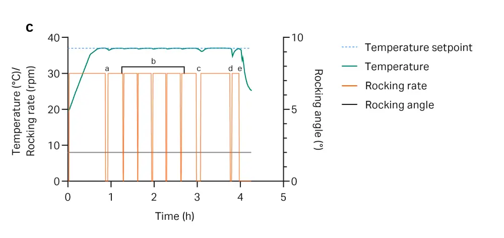 Fig 12. ReadyToProcess WAVE™ 25 Rocker process data from large-scale linearization reaction. (a) addition of EcoRI and reaction initiation; (b) sampling; (c) Cellbag™ biocontainer harvest.