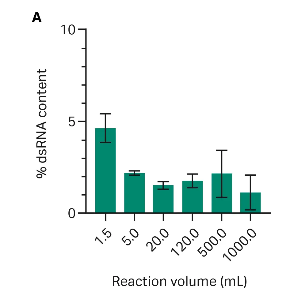 In both cases dsRNA content was < 1% and no RNase activity was detected. Moreover, residual DNA content was found to be 59 ng DNA/mg RNA—below regulatory specifications of 10 ng/dose for typical mRNA products, even prior to downstream processing (7).