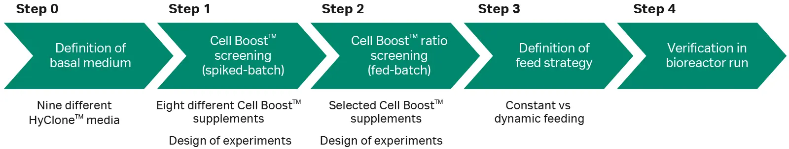 Fed‑batch processes are commonly applied in cell culture production to supply critical nutrients at physiological conditions and drive cell performance towards excellence. The optimal high‑performing basal medium and feed solution and the optimal feed regimen are often combined for a given cell line to boost antibody titers to g/L in straightforward fed‑batch processes. The workflow outlined in Figure 1 is exemplified for a mAb-producing CHO cell line after medium screening and adaptation to HyClone™ CDM4NS0 basal medium (Step 0). After the initial basal medium screening, we used a DoE approach to identify the optimal combination of different supplements that enhanced cell culture performance in spiked batch experiments (Step 1). In this DoE study, levels ranged from no feed addition to a maximum addition to reach a final osmolality of 400 mOsm/kg in the spiked basal medium. We then applied the optimal combination of supplements in a fed‑batch process by daily bolus addition of the feed solution (Step 2).