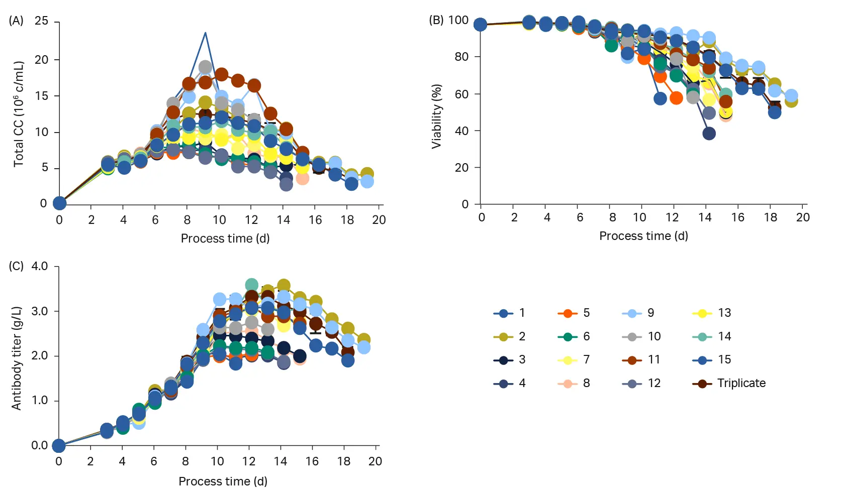 Fig 5. Cell growth and productivity for Step 2. (A) Total cell concentrations (CC), (B) cell viability, and (C) mAb titer.