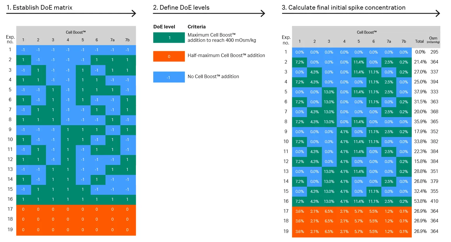 A high osmolality above 400 mOsm/kg is often considered a critical upper limit in spiked media, above which cell performance is detrimentally impacted. The lowest DoE level of ‑1 is defined as no supplement addition, and DoE level 0 is defined as the half‑maximum supplement addition.