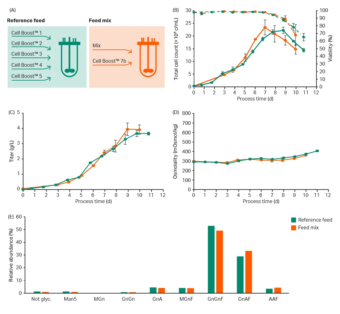 Feed additions were calibrated to maintain osmolality between 400 to 600 mOsm/kg in the model system, as excessive osmolality can negatively impact CHO cell performance.