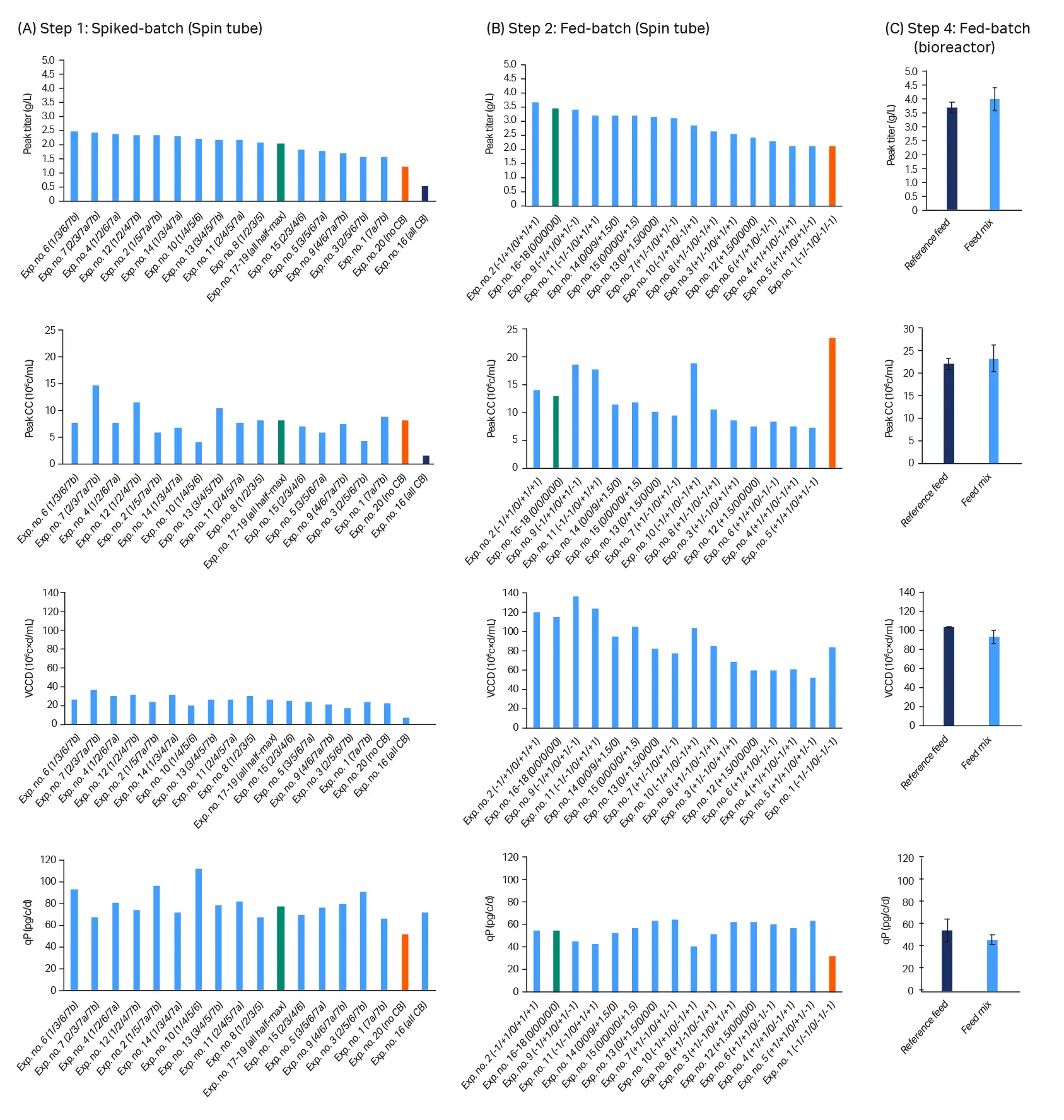 Figure 6 summarizes cell culture data for the two DoE screening steps (Steps 1 and 2) and the final controlled bioreactor run (Step 4), in which the optimized feed composition and daily constant 8.77% feed regimen were verified. We prepared the same supplement combination as different formulations and fed to the cultures according to Figure 7A. Feed solution was prepared from premixed powder formulations (Feed mix).