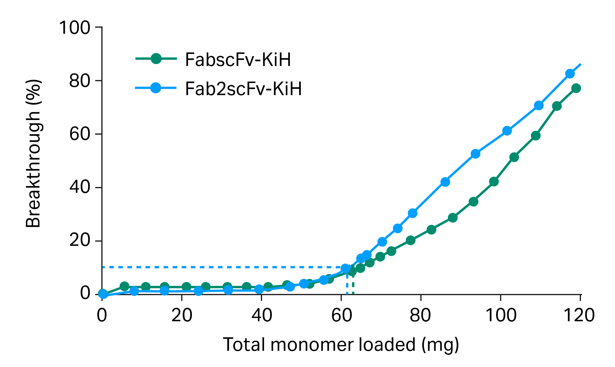 The experiments were performed using a 1 mL Tricorn™ (5/50) chromatography column with a bed height of approximately 5 cm to minimize the usage of the material. Neutral pH binding conditions, that is, PBS-like conditions, were used. The flowthrough (FT) was collected, and each fraction was analyzed by SEC-HPLC and the feed background was subtracted from the signal. The breakthrough curve is shown in Figure 2. The dynamic binding capacity (DBC) was determined at 10% breakthrough (QB10%) to be 63 mg/mL for FabscFv-KiH and 61 mg/mL for Fab2scFv-KiH.