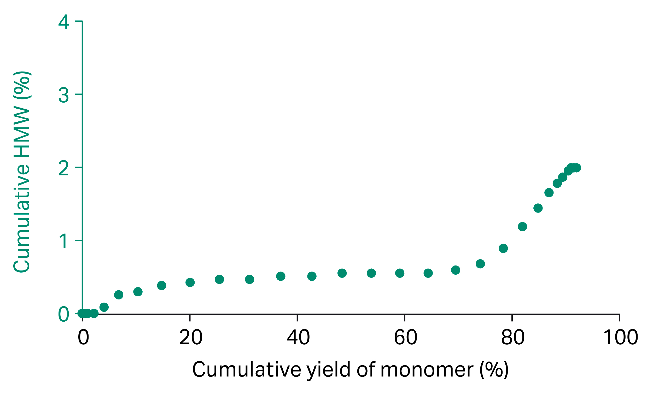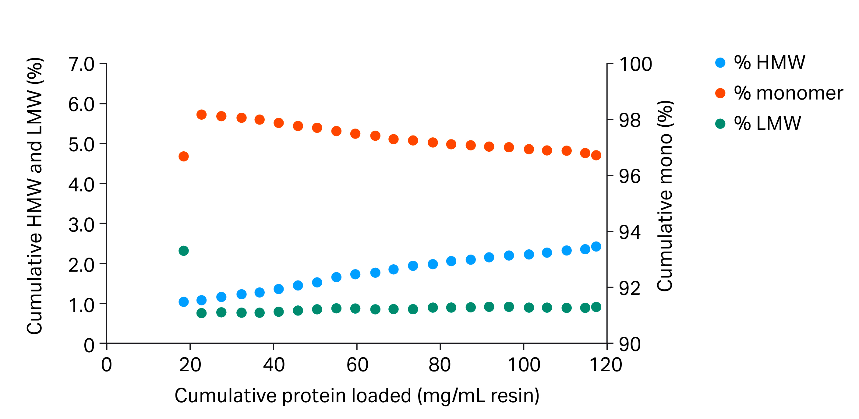 Plotting the cumulative yield of monomer versus yield of HMW aggregates shows that the HMW aggregates bind strongly to the resin and that the original content of > 10% HMW aggregates was reduced down to 2% when collecting the full peak (Fig 9).