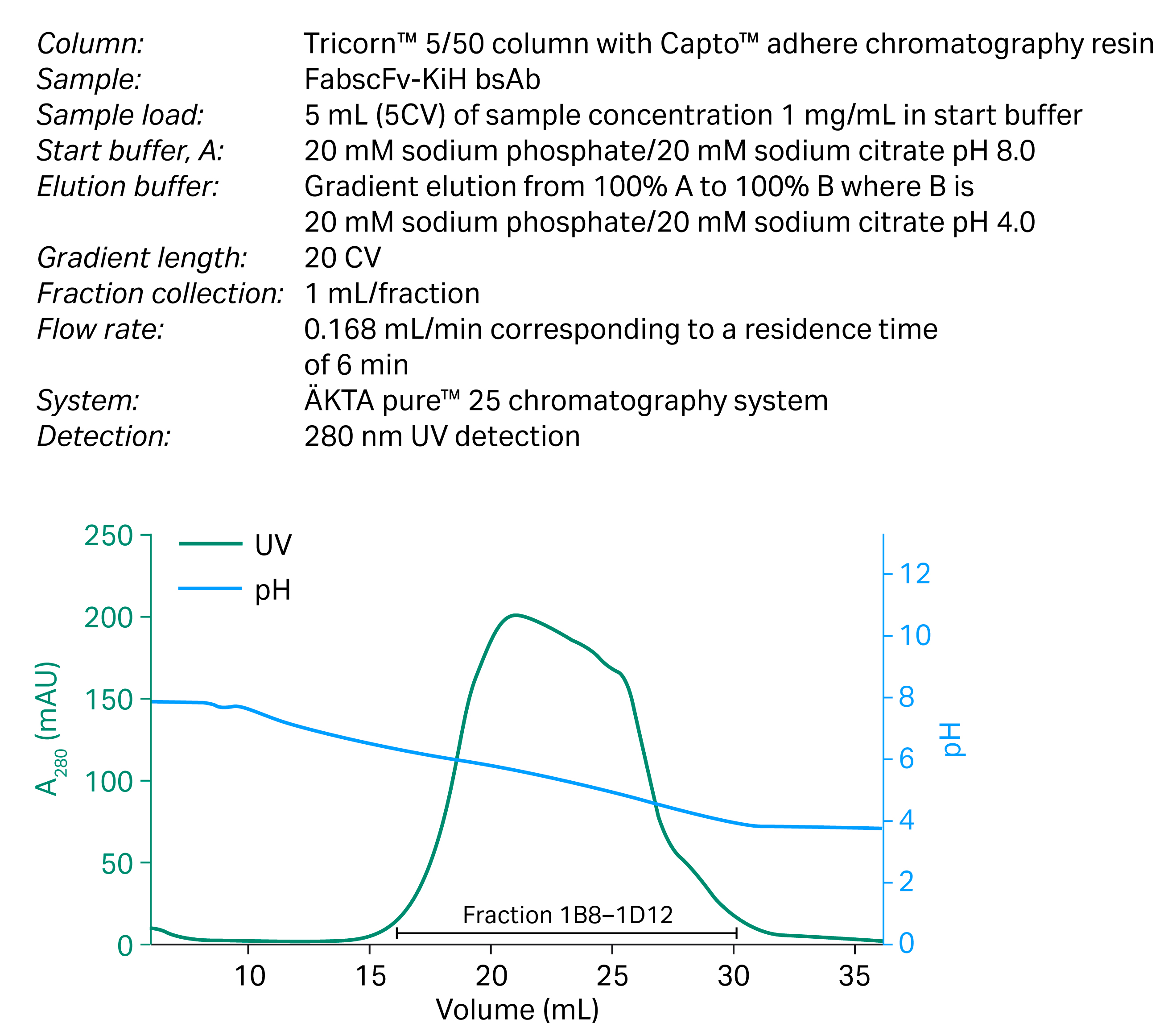 For the second bsAb (Fab2scFv-KiH) similar experiments were performed and almost the same conditions were found. The pH in wash was lowered to 4.3, compared to 4.6 for the FabscFv-KiH bsAb, to get good removal of impurities. Also, the Fab2scFv-KiH bsAb eluted at pH 3.6 with a monomeric yield of approximately 90%, and a bsAb purity level above 90%.