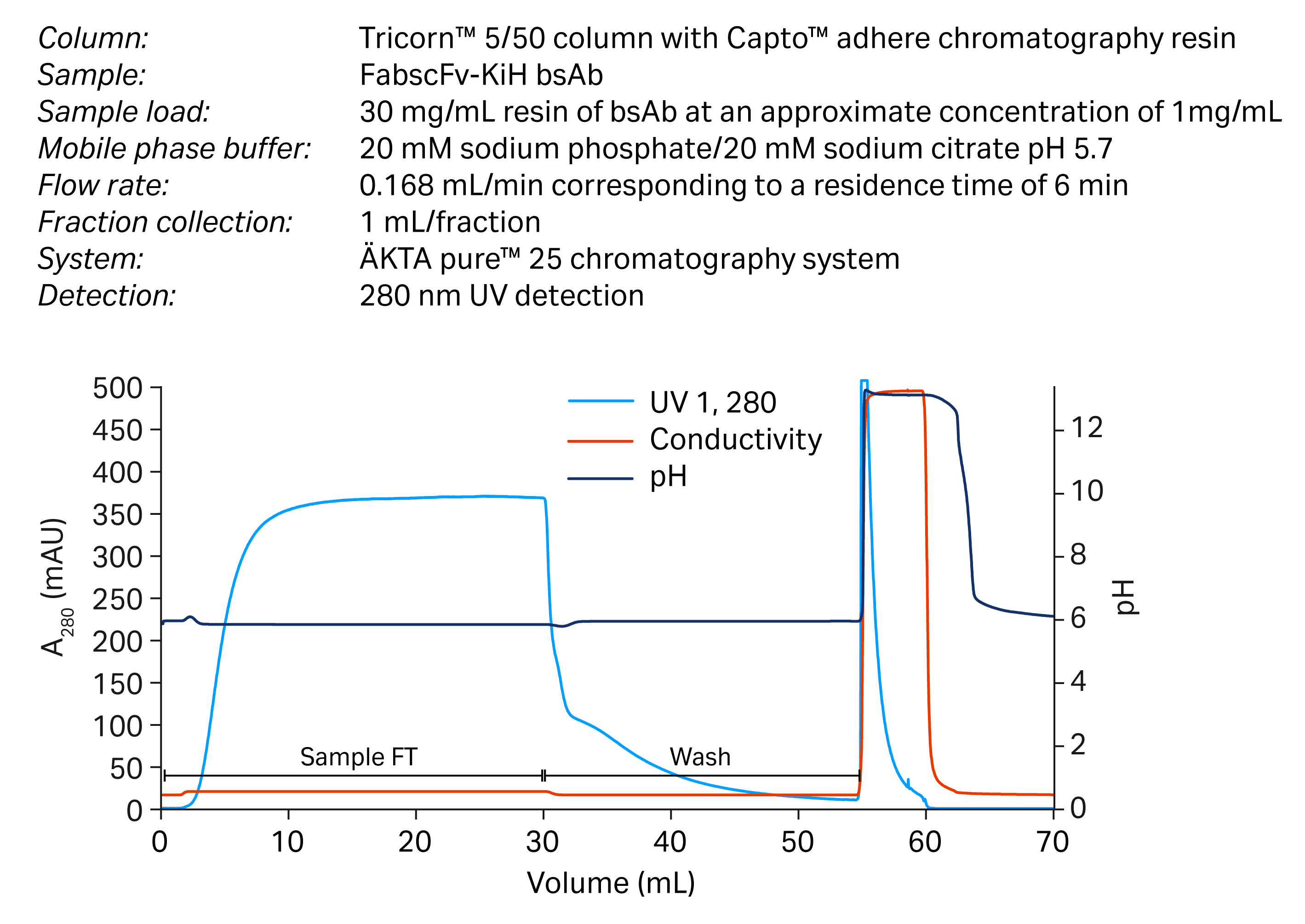 Fig 10. Chromatogram from a load of 30 mg bsAb/mL resin. The FT was collected as well as the wash fraction.