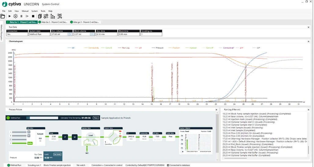 Three ÄKTA go™ instruments were connected to a shared UNICORN™ 7.13 database and controlled from a single client.